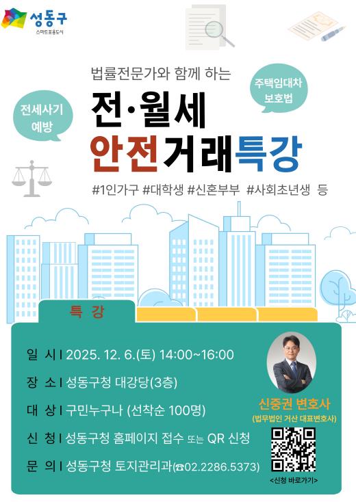 서울 성동구는 오는 12월 6일 오후 2시 성동구청 3층 대강당에서 법률 전문가와 함께하는 ‘전월세 안전거래 특강’을 개최한다.