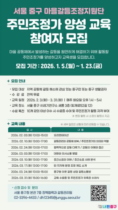 서울 중구가 주민 스스로 갈등을 조정하고 마을의 신뢰를 회복할 수 있도록 돕는 ‘주민조정가’를 양성해 따뜻한 공동체 문화를 만들어가고 있다. 구는 2024년 마을갈등조정지원단 제1기 주민조정가에 이어, ‘제2기 주민조정가 신규 양성 교육’에 참여할 교육생을 공개 모집한다.