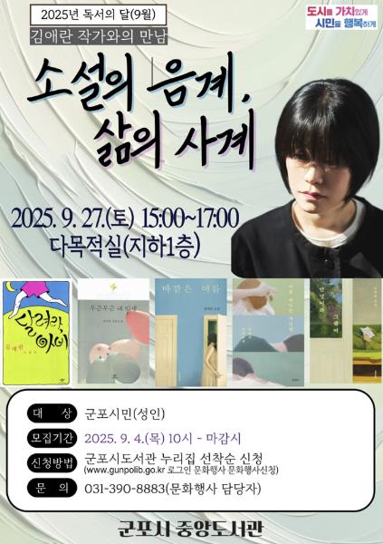 군포시 중앙도서관은 9월 독서의 달을 맞아 시민들과 함께 책의 가치를 나누고 문학적 감성을 풍성하게 채워줄 다채로운 문화 행사를 준비했다. 이번 행사는 특강, 공연, 체험, 전시 등으로 구성되며, 군포시민 누구나 참여할 수 있다.