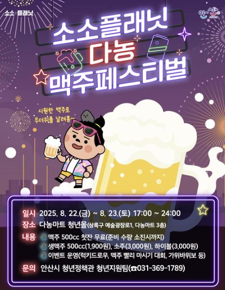 안산시는 오는 22일부터 23일까지 양일간 청년몰 활성화를 위해 ‘소소플래닛 다농(상록구 예술광장로 1)’에서 고객 감사축제 ‘맥주 페스티벌’을 개최한다고 14일 밝혔다.