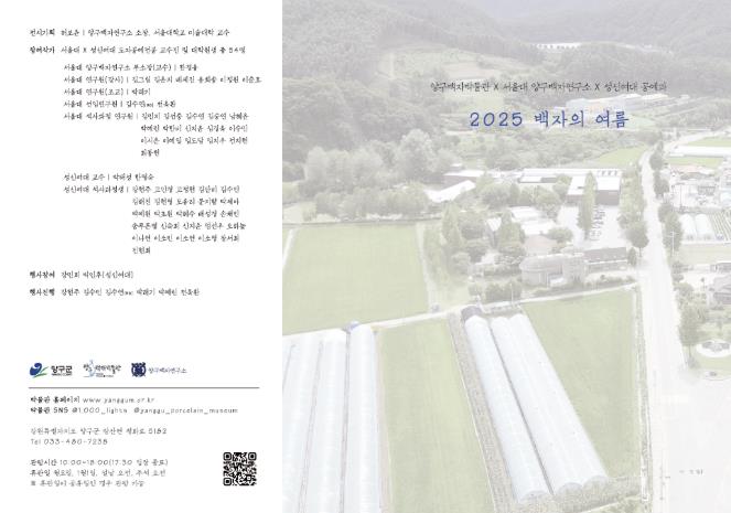 ‘2025 백자의 여름’은 양구군, 양구백자박물관, 서울대학교 미술대학 양구백자연구소가 함께 추진하는 사업으로, 양구백자연구소 연구원과 서울대학교‧성신여자대학교 미술대학 도예 전공 교수·학생 등 50여 명이 전시에 참여했다.
