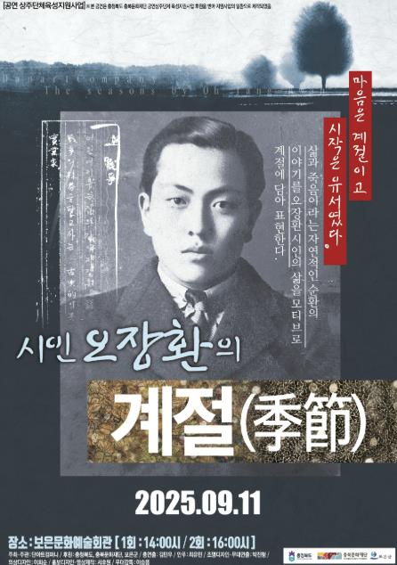 이번 작품은 보은군이 낳은 천재 시인 오장환의 삶을 모티브로 그의 일대기와 인간 내면의 다양한 감정을 사계절의 흐름 속에 담아낸 창작 무용극으로 9월 12~13일에 양일간 열리는 ‘제30회 오장환문학제’와 연계해 지역의 대표 문화예술 축제를 더욱 풍성하게 만들 예정이다.