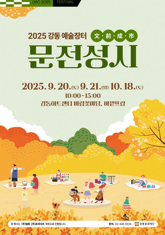 강동문화재단은 오는 9월 20일, 9월 21일, 10월 18일 세 차례에 걸쳐 강동아트센터 야외 바깥뜨랑과 바람꽃마당에서 ‘2025년 강동 예술장터 ‘문전성시(文前成市)’‘를 개최한다.