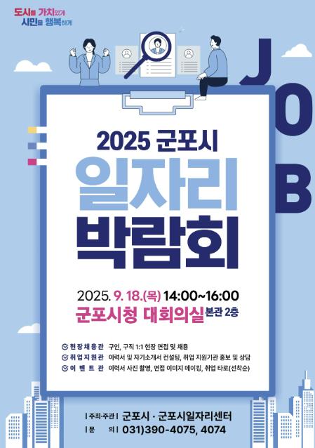 군포시는 오는 9월 18일 오후 2시, 군포시청 대회의실에서 ‘2025년 하반기 군포시 일자리 박람회’를 개최한다. 이번 박람회는 지역 내 우수 기업과 구직자가 직접 만나는 채용의 장으로 일자리 기회를 제공할 예정이다.