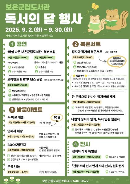 보은군립도서관은 9월 ‘독서의 달’을 맞아 문학과 음악, 공연이 어우러진 특별한 무대를 준비한다고 26일 밝혔다.