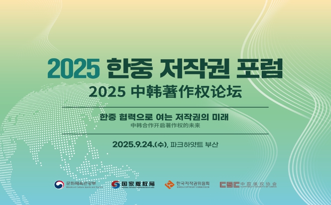 문화체육관광부는 한국저작권위원회, 중국 국가판권국과 함께 9월 24일, 파크하얏트 부산에서 ‘2025 한중 저작권 정부간회의(오전)’와 ‘2025 한중 저작권 포럼(오후)’을 열어 저작권 보호를 위한 양국 협력 방안과 인공지능(AI), 블록체인 등 기술 발전에 따른 저작권 정책 변화 및 대응을 논의한다.