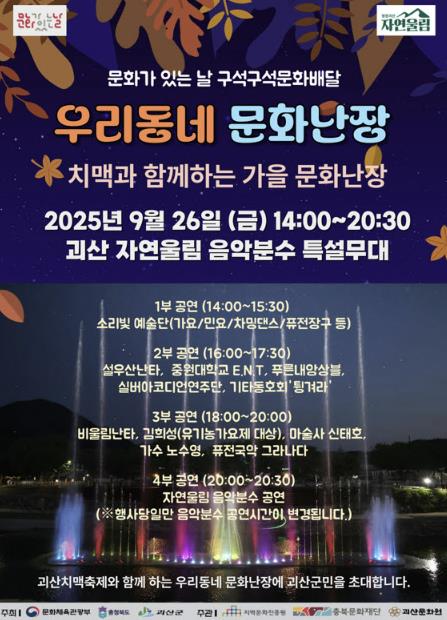 충북 괴산군은 ‘문화가 있는 날’ 주간을 맞아 오는 26일 오후 2시, 자연울림 음악분수 앞 특설무대에서 ‘문화가 있는 날 구석구석 문화배달 '우리동네 문화난장'’ 제7회차 행사를 개최한다고 밝혔다.