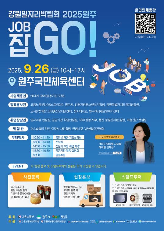 원주시와 고용노동부는 오는 26일 오전 10시부터 오후 5시까지 원주국민체육센터에서 ‘강원일자리박람회 2025 원주 잡(JOB) GO!’를 개최한다.