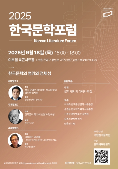 문화체육관광부는 국립한국문학관과 함께 9월 18일(목) 오후 3시, 이호철 북콘서트홀(서울 은평구)에서 ‘2025 한국문학포럼’을 개최한다.