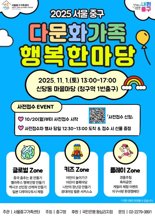 서울 중구는 오는 11월 1일 오후 1시부터 5시까지 신당동 마을마당(청구역1번 출구 옆) 에서 ‘다문화가족 행복한마당’이 개최된다고 밝혔다.