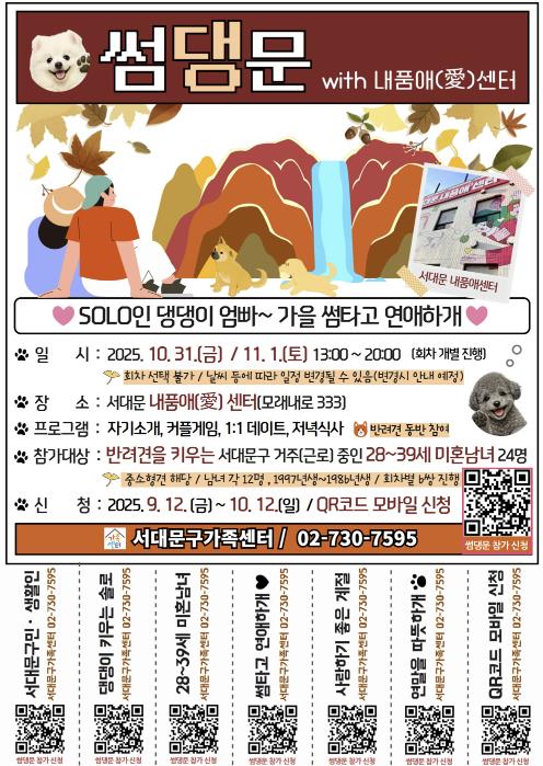 서대문구는 서대문구가족센터가 10월 31일과 11월 1일 서대문 내품애(愛)센터(모래내로 333)에서 반려견을 키우는 미혼남녀 만남 행사 ‘썸댕문 with 내품애센터’를 개최한다고 17일 밝혔다.