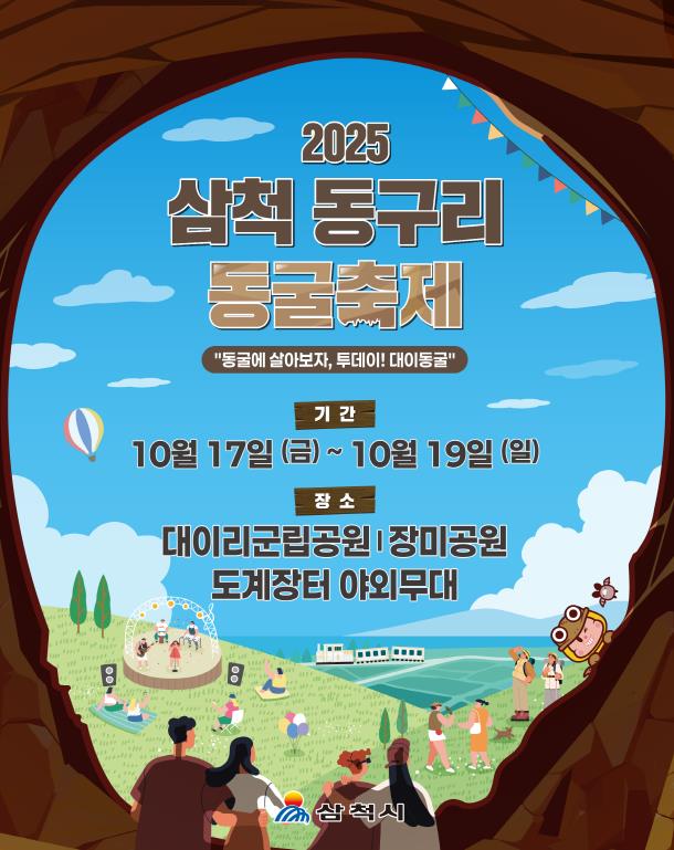 삼척 동구리 동굴축제가 10월 17~19일 대이리군립공원(대이동굴)·삼척장미공원·도계장터 야외무대에서 동시에 열린다. ‘동굴에 살아보자, 투데이! 대이동굴’을 슬로건으로 한 올해 축제는 가족 공연과 실감형 동굴체험, 도심·생활권 무대를 셔틀망으로 연결하는 분산형 운영으로 하루 동선을 완성했다.