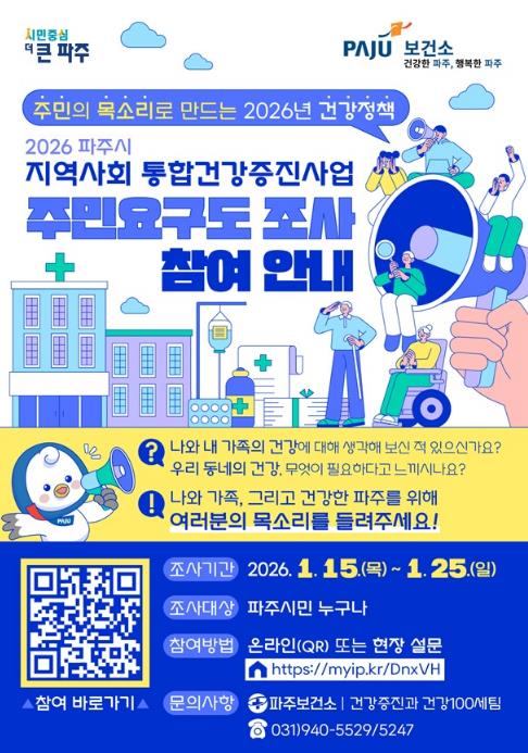 파주시는 시민의 건강한 삶을 지원하기 위해 '2026년 지역사회 통합건강증진사업’추진에 앞서 주민건강요구도 조사를 실시한다.