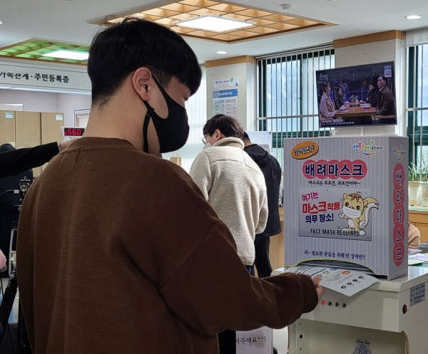 최근 다중이용시설 마스크 착용 의무화가 시행 중인 가운데 마스크를 분실하거나 깜빡한 주민들이 마스크를 구입하는 수고를 덜고 공공시설 이용객이 감염에 대한 불안감을 해소할 수 있도록 동 행정복지센터와 도서관, 종합사회복지관 등에 ‘배려 마스크 함’을 비치했다.