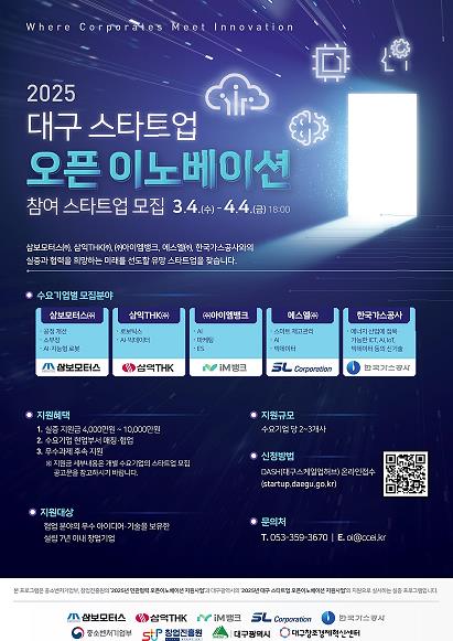 대구광역시는 지역의 선도기업 5개사와 스타트업의 기술협력을 통한 동반성장을 지원하는 ‘2025년 대구 스타트업 오픈이노베이션 지원사업’에 참여를 희망하는 스타트업을 모집한다.