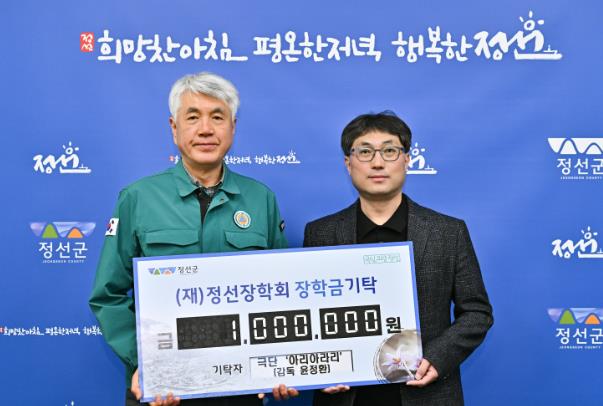 윤정환 아리아라리 연출은 11일 (재)정선장학회를 방문해 지역 인재 육성을 위해 써달라며 최승준 정선군수에게 장학금 100만원을 기탁했다.