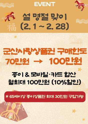 군산시가 설 명절을 맞아 2월 한 달간 군산사랑상품권의 1인당 월 구매 한도를 기존 70만 원에서 100만 원으로 한시적으로 전격 상향한다고 26일 밝혔다.