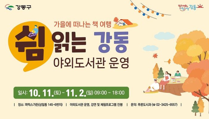 강동구는 10월 11일부터 11월 2일까지 한 달간 파믹스가든(상일동 145-6)에서 주말 야외 도서관 '쉼 읽는 강동'을 운영한다고 밝혔다.
