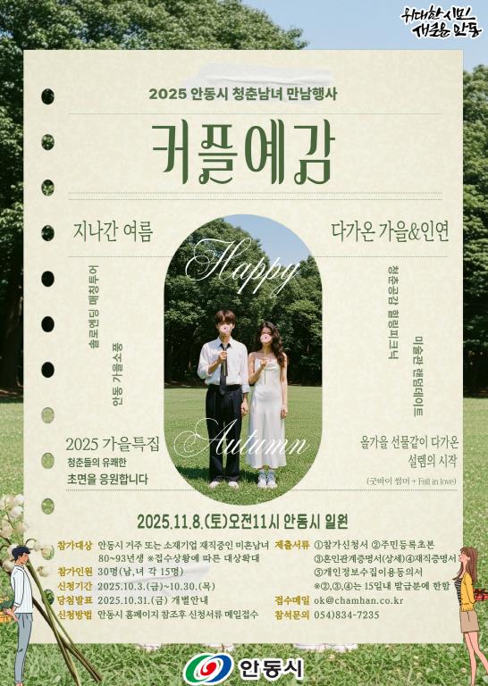 안동시가 청춘남녀의 건강한 만남을 지원하기 위해 마련한 ‘2025 커플예감! 힐링피크닉’ 시즌4 참가 신청을 10월 30일까지 접수한다.