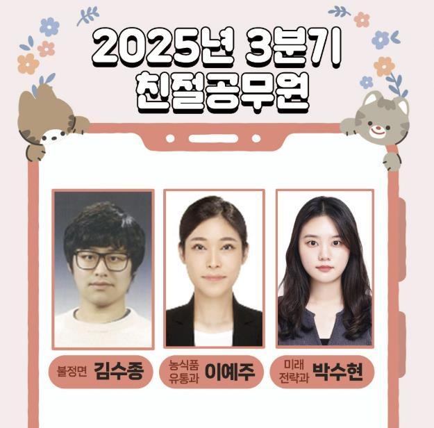 충북 괴산군은 2025년 3분기 친절공무원으로 김수종 주무관(불정면사무소), 이예주 주무관(농식품유통과), 박수현 주무관(미래전략과)을 선정했다고 밝혔다.