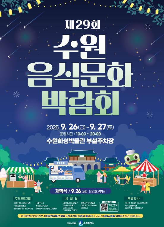 9월 26일~27일 개최되는 제29회 수원음식문화박람회에서는 다채로운 먹거리를 만나고, 온 가족이 함께 즐길 수 있는 다양한 만들기 체험 프로그램을 경험할 수 있다. 또 식품 안전에 대해 쉽고 재미있게 배울 수 있다.