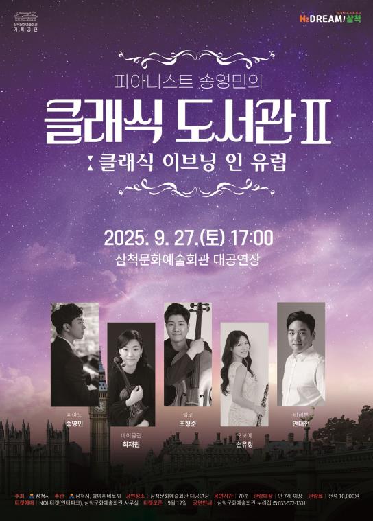 삼척시는 오는 9월 27일, 10월 28일, 11월 25일 세 차례에 걸쳐 문화예술회관 대공연장에서 '클래식 도서관Ⅱ: 클래식 이브닝 인 유럽' 기획공연을 개최한다고 밝혔다.