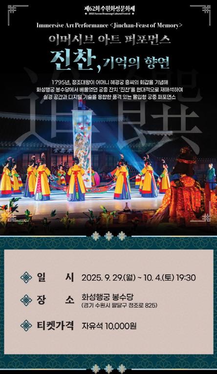 수원시는 제62회 수원화성문화제 기간 중 화성행궁 봉수당에서 이머시브 아트(몰입형 예술) 무용극 ‘진찬: 기억의 향연’을 선보인다.