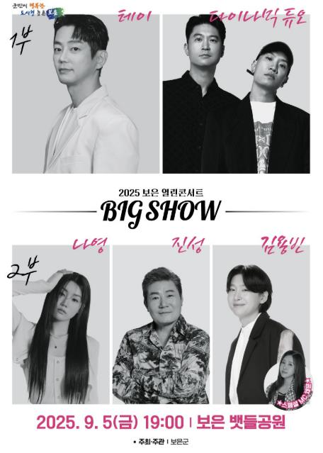 보은군은 군민들에게 고품격 문화예술을 선사하기 위해 오는 9월 5일 저녁 7시, 보은읍 뱃들공원 야외공연장에서 ‘2025 보은 빅쇼 열린콘서트’를 개최한다.