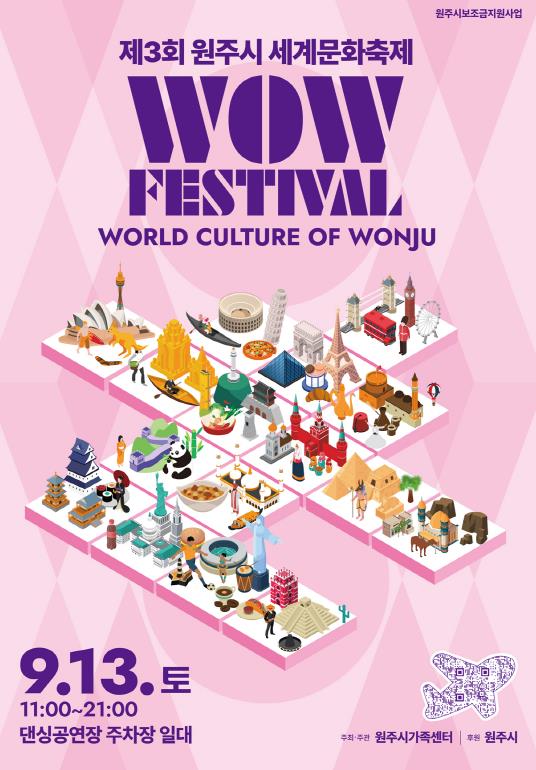 원주시가족센터는 오는 13일 오전 11시부터 오후 9시까지 ‘제3회 원주시 세계문화축제: 와우 페스티벌(WOW FESTIVAL)’을 개최한다.