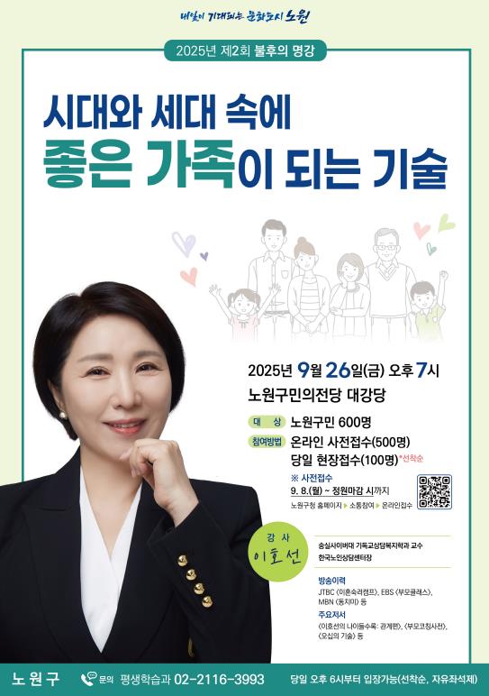 오승록 노원구청장은 “세대와 관계의 변화 속에서 가족을 돌아보는 시간이 되기를 바란다”며 “앞으로도 불후의 명강을 통해 구민이 공감하고 함께 성장할 수 있는 배움의 장을 계속 열어가겠다”고 말했다.