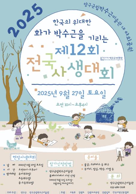 전국 사생대회는 유아부, 초등부, 중·고등부로 나뉘어 진행된다. 참가비는 무료이며, 참가 신청은 오는 9월 20일까지 박수근미술관 홈페이지를 통해 신청하면 된다. 대회 당일 오전 9시부터 10시까지는 선착순으로 현장 신청도 가능하다.