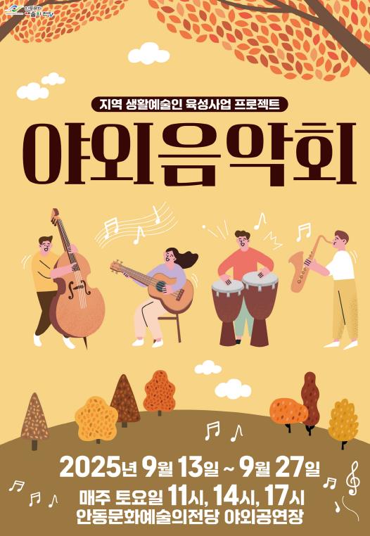 안동문화예술의전당은 오는 9월 13일을 시작으로, 3주간에 걸쳐 지역 생활예술인 육성지원 사업 ‘2025년 안동문화예술의전당 야외음악회’를 안동문화예술의전당 야외공연장에서 무료로 개최한다.