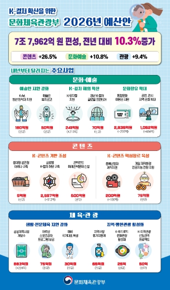 문화체육관광부 2026년 예산안은 7조 7,962억 원으로 2025년 대비 10.3%(7,290억 원) 증가했다. 이는 2020년 이후 가장 큰 폭의 증가로, 이를 통해 ‘케이-컬처’의 성장을 가속화하고 국민들의 ‘케이-컬처’ 향유 기회를 더욱 확대할 것으로 기대된다.