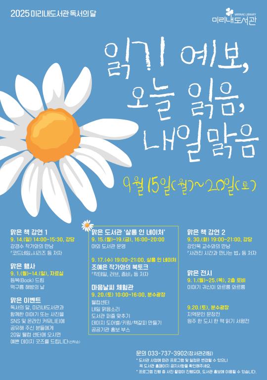 9월 20일에는 '마음 날씨 체험관'행사가 미리내도서관 분수광장에서 진행되고, ▲데이지 도어벨, 데이지키링 만들기 등 체험 프로그램 ▲원주시문인협회 회원의 작품 속 문장전 ▲혁신도시 공공기관 직원들의 한 도시 한 책 읽기 서평 전시 ▲공공기관 홍보 부스도 마련된다.