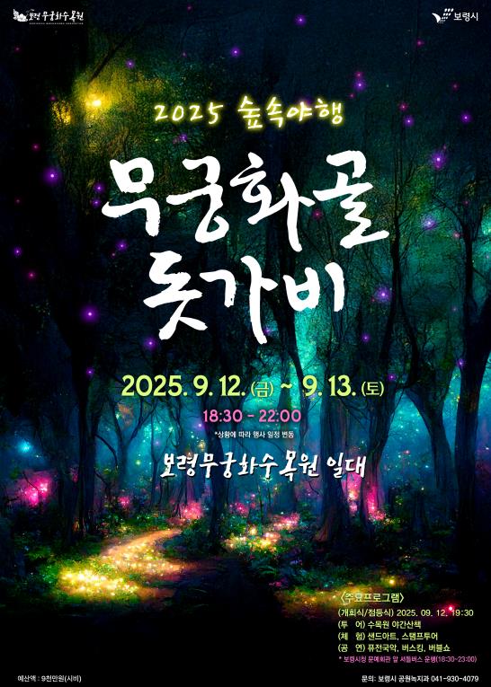 보령시는 2025 숲속야행 ‘무궁화골 돗가비’ 행사를 오는 9월 12일부터 13일까지 2일간 보령무궁화수목원 일원에서 개최한다고 밝혔다.