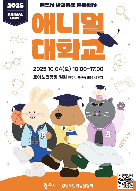 원주시농업기술센터는 10월 4일 오전 10시 원주천 로아노크광장에서 반려동물 문화행사 ‘애니멀 대학교’를 개최한다.