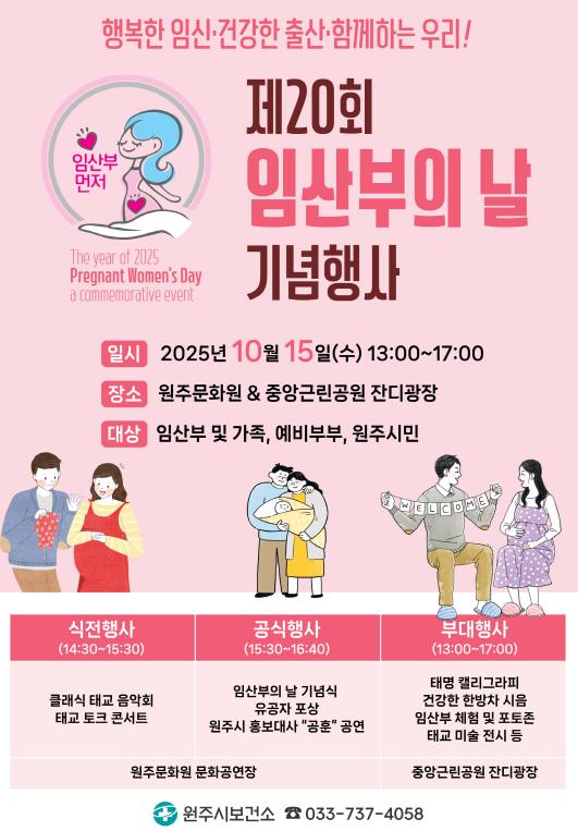 원주시보건소는 임산부의 날을 맞아 오는 15일 원주문화원에서 임산부와 가족, 예비부부, 그리고 시민 모두가 함께하는 ‘임산부의 날 기념행사’를 개최한다.