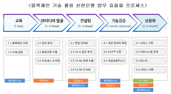 이런 전략에 발맞춰 신한은행은 업무의 효율성과 보안성을 높이기 위해 `블록체인 Lab`을 중심으로 블록체인 기술을 적용할 수 있는 분야를 선정하고 담당 부서 교육 및 컨설팅을 거쳐 업무 상용화에 이르는 프로세스를 확립했다.