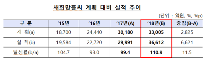 국내은행은 지난해 25만2740명에게 3조6612원을 공급해 전년의 목표 달성률(99.4%) 보다 11.5%포인트 상승한 수치를 보였다.
