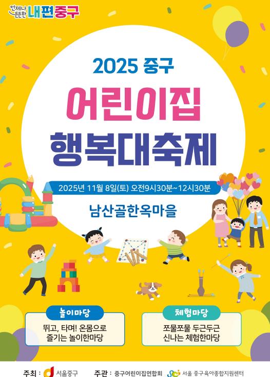 서울 중구는 오는 11월 8일 토요일 오전 9시 30분부터 12시 30분까지 남산골 한옥마을 천우각 광장 일대에서 '2025 중구어린이집 행복대축제'가 개최된다고 밝혔다.