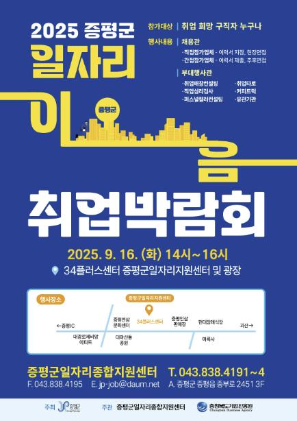 충북 증평군은 지역 일자리 창출 및 구인ㆍ구직자간 미스매칭 해소를 위해 오는 16일 34플러스센터 3층과 광장에서 ‘2025년 일자리 이음 취업박람회’를 연다.