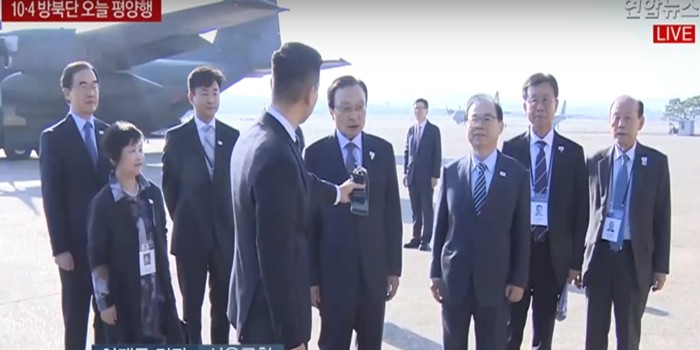 | ▲4일 오전 평양에서 열리는 10·4 남북공동선언 기념행사에 참석하는 이해찬 더불어민주당 대표가 성남 서울공항에서 수송기 탑승 전 인터뷰를 하고 있는 모습. <사진=연합뉴스 TV 갈무리> |