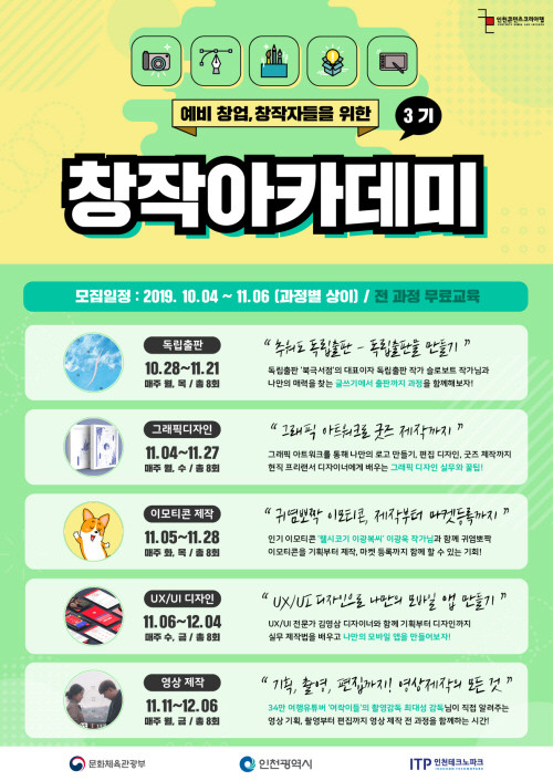 이번 창작아카데미 3기 과정에서는 ▲독립출판 ▲그래픽디자인 ▲이모티콘제작 ▲영상제작 ▲UX/UI 디자인 총 5개 분야의 교육이 동시에 진행된다.