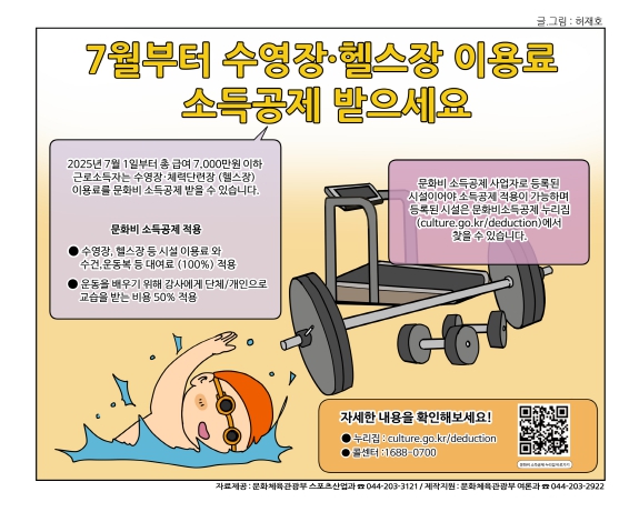 문화체육관광부는 7월부터 시행되는 ‘체육시설 이용료 소득공제’의 적용 대상이 기존의 체력단련장업 및 수영장업에서 공공체육시설과 종합체육시설업까지 확대된다고 밝혔다.