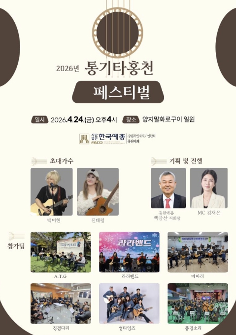 (사)한국예총 홍천지회가 주관하는 2026 통기타 홍천 페스티벌이 오는 4월 24일 오후 4시 홍천 양지말화로구이 일원에서 열린다.