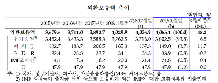 한국은행이 8일 발표한 `2019년 1월 말 외환보유액`에 따르면 지난달 말 기준 외환보유액 잔액은 4055억5000만달러(약 456조6000억원)로 지난해 12월 말(4036억9000만달러)보다 18억2000만달러 증가했다.