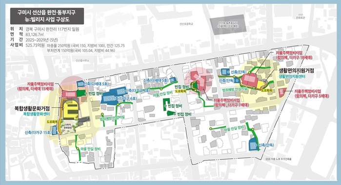 이번 사업은 지난해 12월 국토교통부 ‘뉴:빌리지 공모사업’에 최종 선정된 선산읍 완전·동부지구 노후주거지정비 지원사업으로, 대상지는 선산읍 완전리와 동부리 일원 약 8만 3,126㎡ 규모다. 총사업비는 250억 원으로 국비 150억 원, 도비 25억 원, 시비 75억 원이 투입되며, 2025년부터 2029년까지 5년간 진행된다.