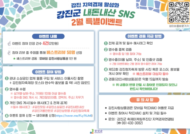 강진군이 관내 소상공인 업소 활성화와 홍보 지원을 위해 추진 중인 ‘강진군 내돈내산 SNS 리뷰 이벤트’를 제53회 강진 청자축제를 기념해 2월 한 달간 특별하게 진행한다.