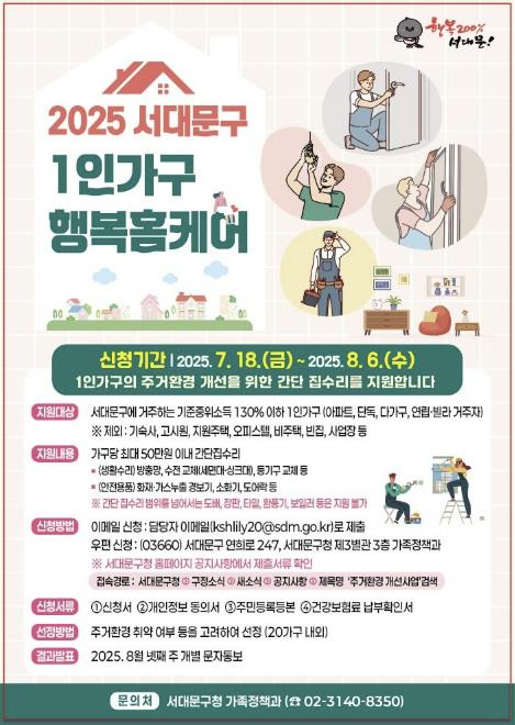 서대문구는 관내 1인 가구 내 소모품 교체와 간단한 집수리를 위해 ‘행복홈케어 사업’을 추진한다고 21일 밝혔다.