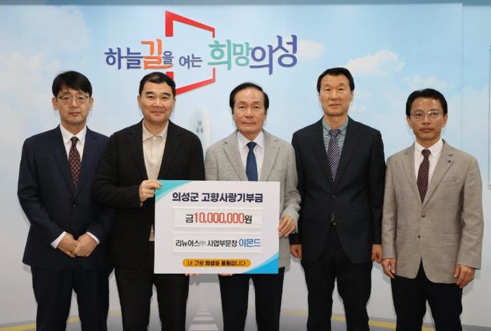 김주수 의성군수는 “뜻깊은 기부를 해주신 리뉴어스㈜ 이몬드 부문장님께 깊은 감사의 말씀을 전하며 기부금은 지역 발전과 군민 복지를 위해 소중히 사용하겠다”라고 답했다.